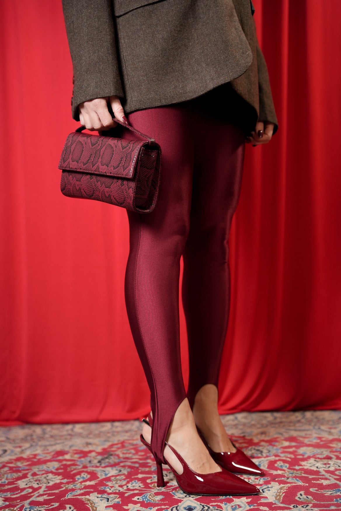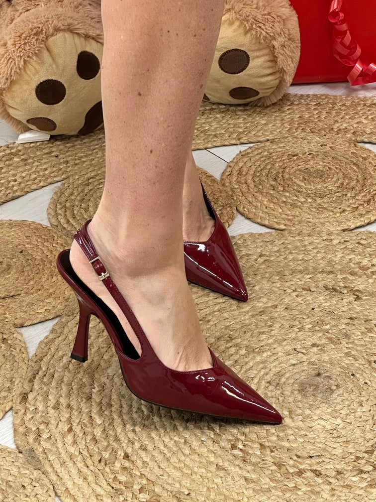 Scarpa con tacco leggermente largo, alto 10 cm, chiusura con fibia  regolabile,ecopelle in vernice.