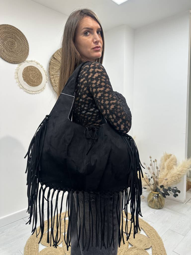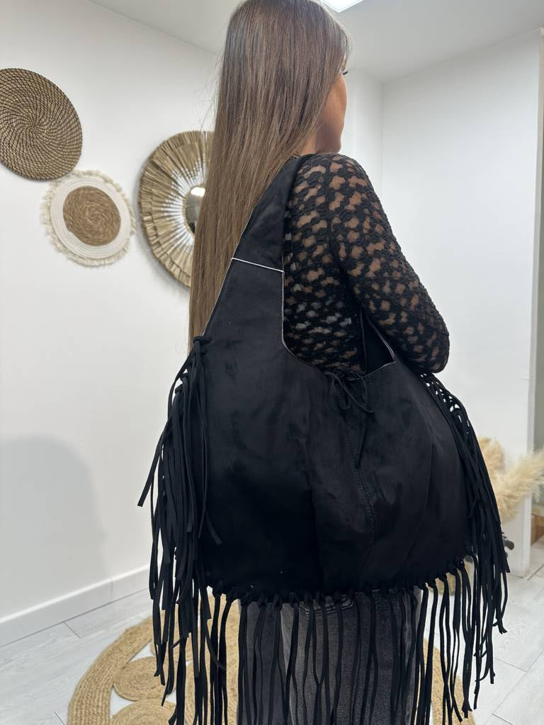 Borsa in suede colore nero, chiusura con bottone e laccetto in tessuto, dettaglio con frange.