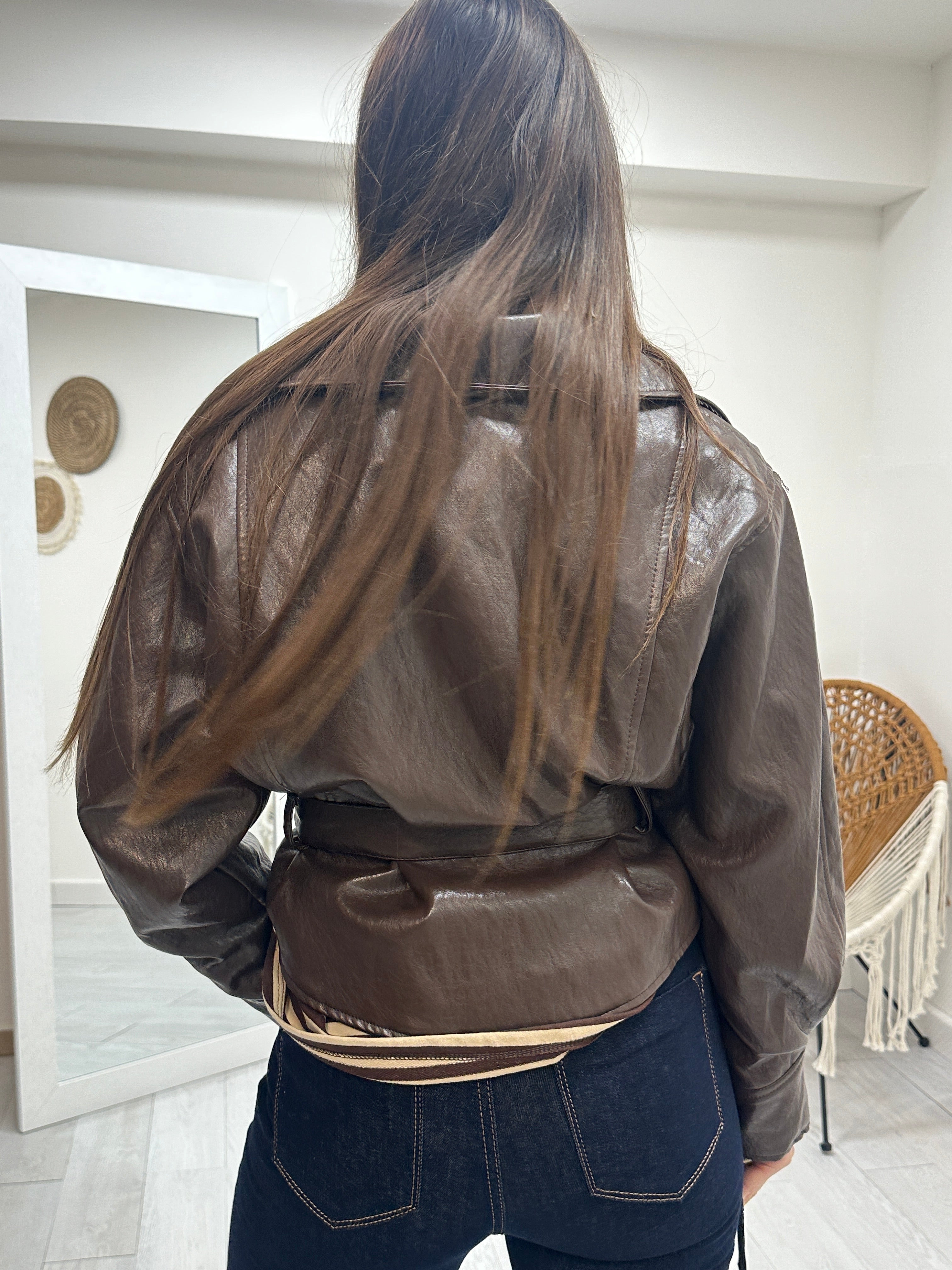 Giacca sfiancata con cintura in vita, chiusura con doppio bottone rivestito in ecopelle.