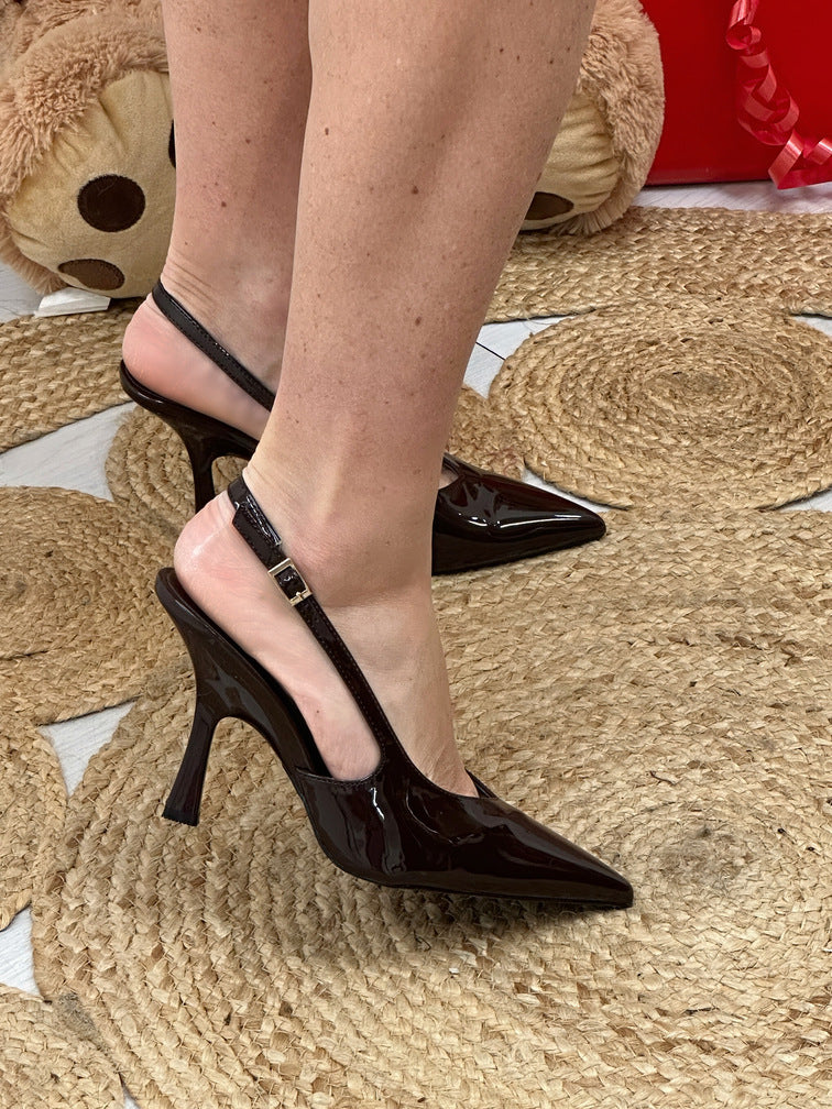 Scarpa con tacco leggermente largo, alto 10 cm, chiusura con fibia  regolabile,ecopelle in vernice.