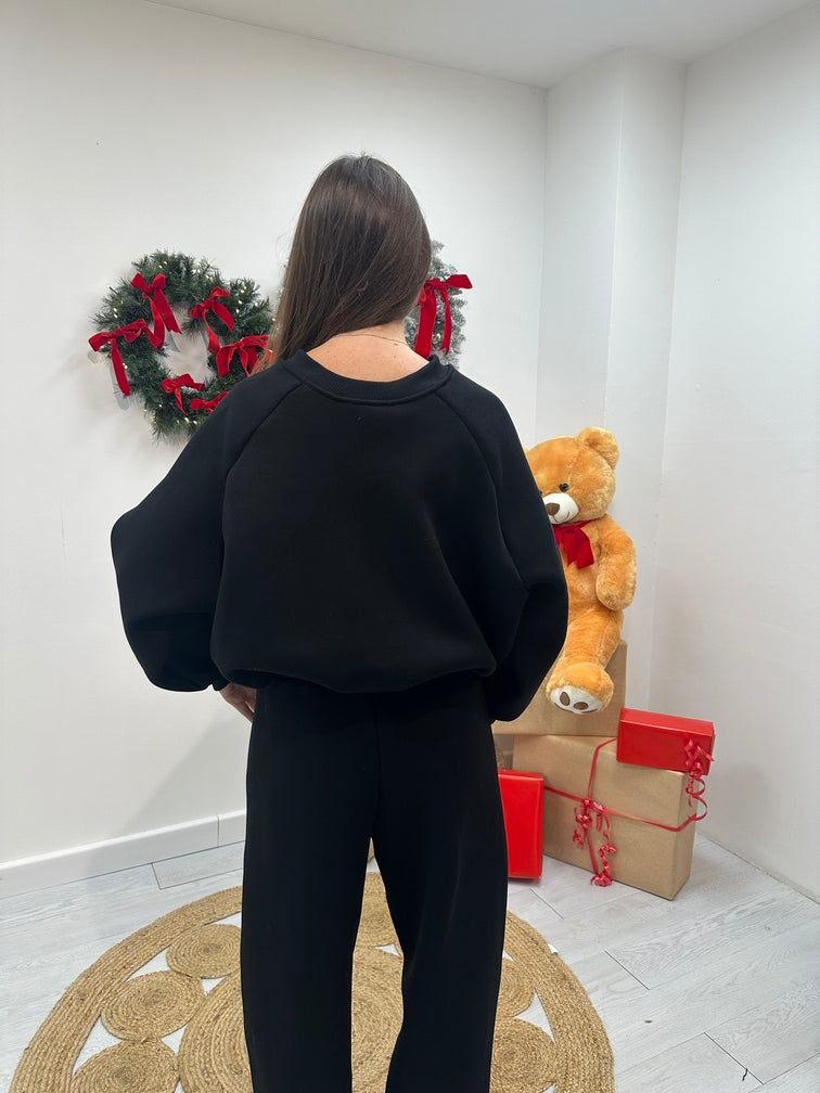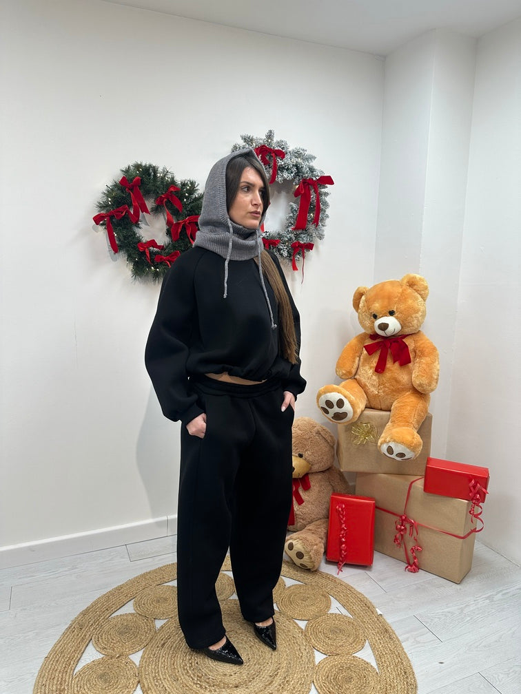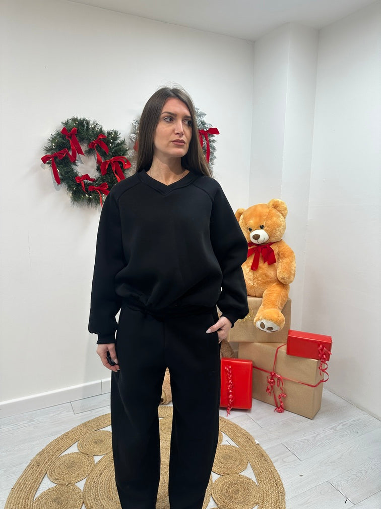 Coordinato tuta taglia unica, veste fino a una 46, linea oversize, felpa rop con elastico in vita e scollo a v, pantalone a palloncino con elastico in vita, internamente felpata.
