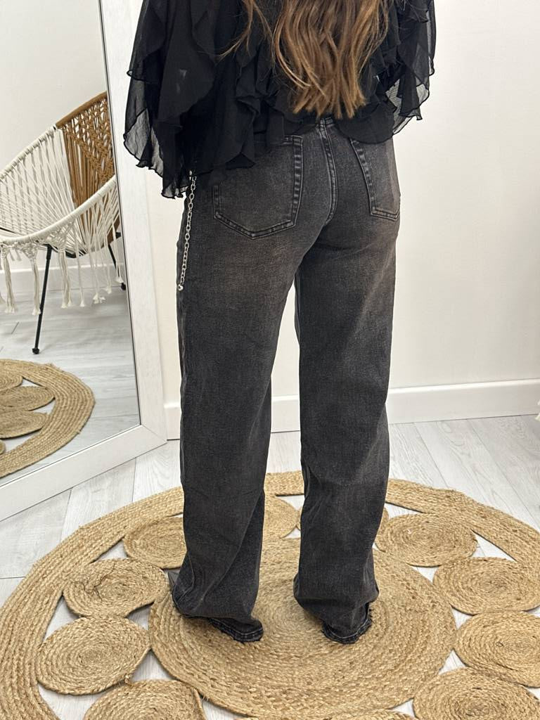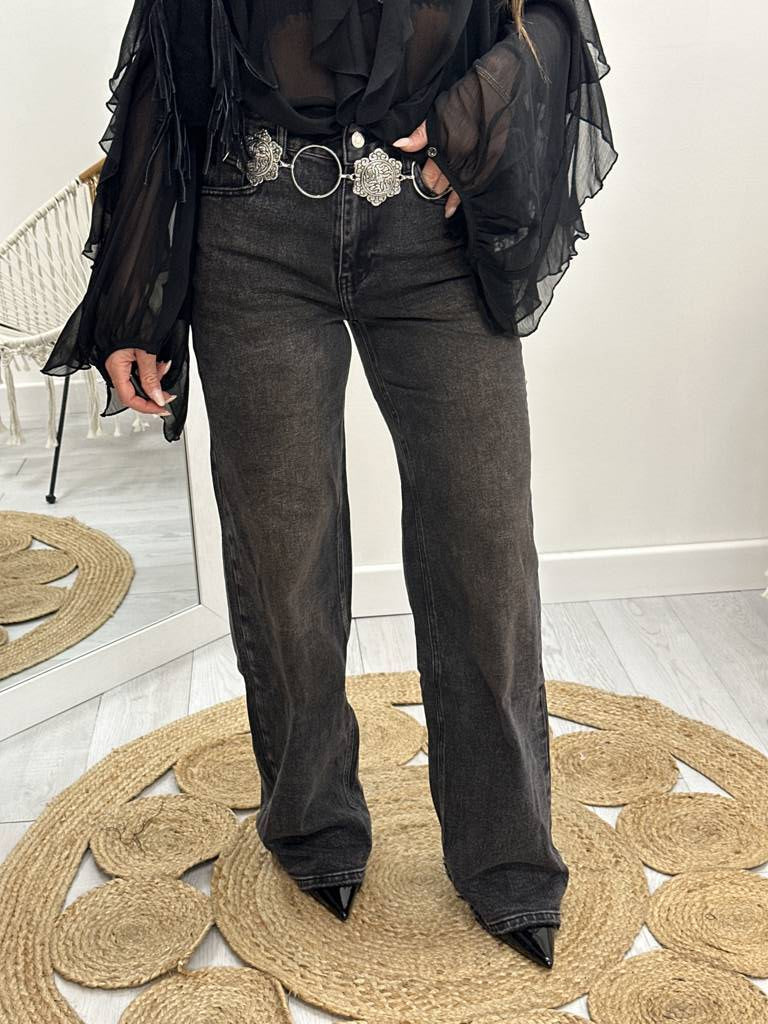 Jeans vita regolare, modello 5 tasche, chiusura con un bottone e zip, tela semi elastica, colore nero slavato.