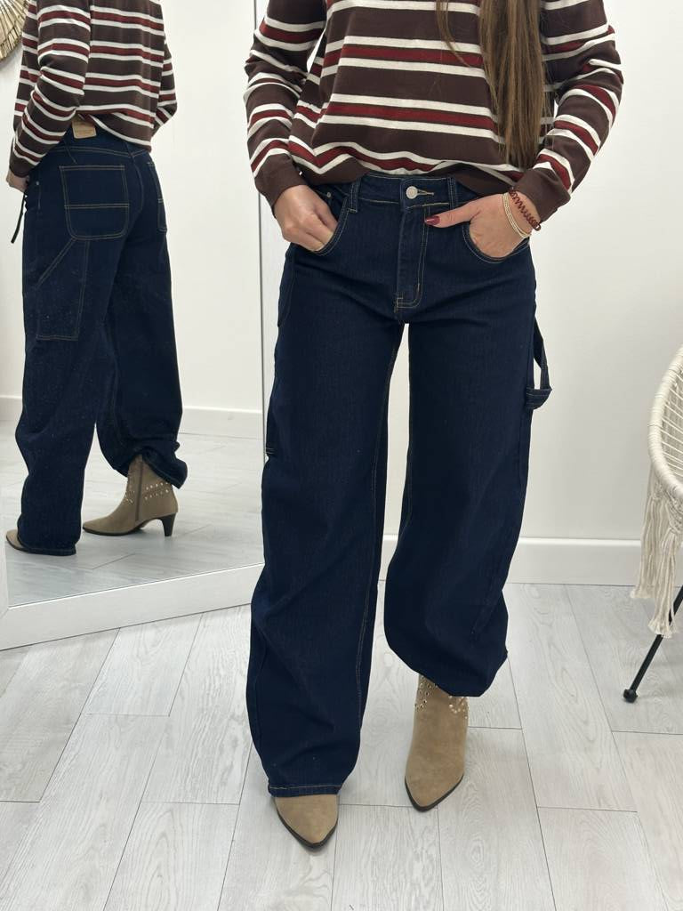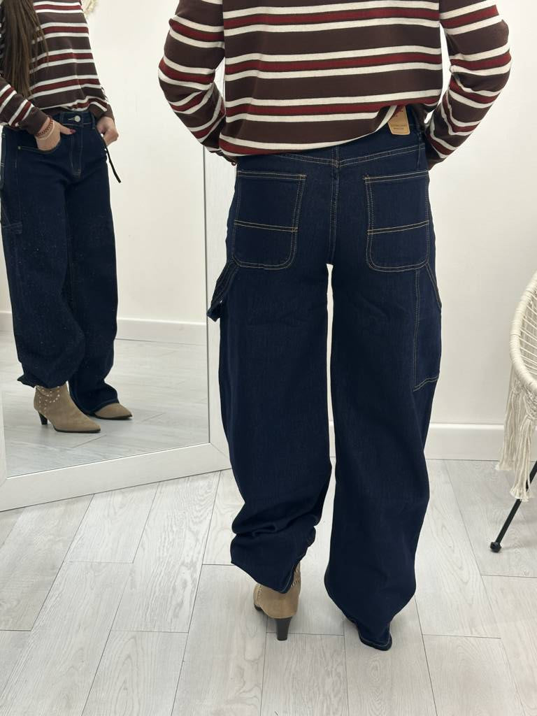 Jeans modello wide ballon carpenter, chiusura con zip e bottone, tela elasticizzata.